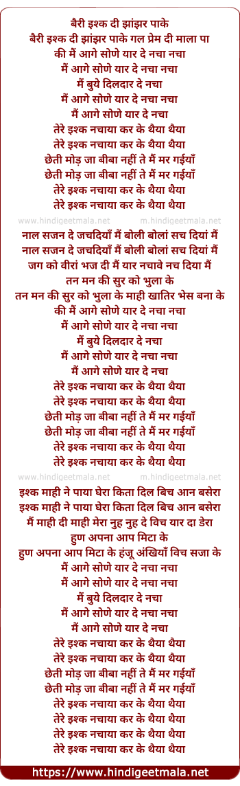 Lyrics of Tere Ishq Nachaya - बैरी इश्क दी झांझर पाके