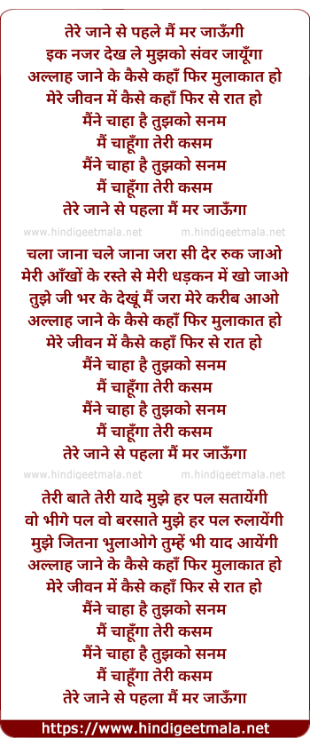 Lyrics of Tere Jaane Se Pehale Main Mar Jaayunga - तेरे जाने से पहले मैं मर जाऊँगी