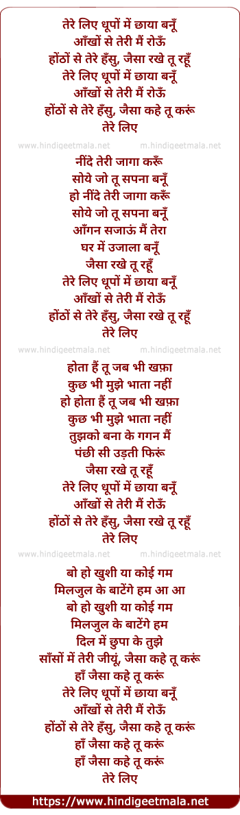 Lyrics of Tere Liye Dhoopo Me - तेरे लिए धूपों में छाया बनूँ
