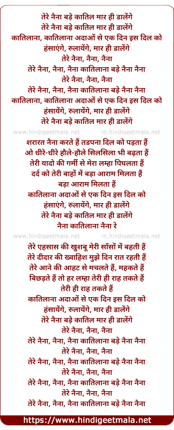 Lyrics of Tere Naina Bade Qaatil Maar Hi Dalenge - तेरे नैना बड़े कातिल मार ही डालेंगे