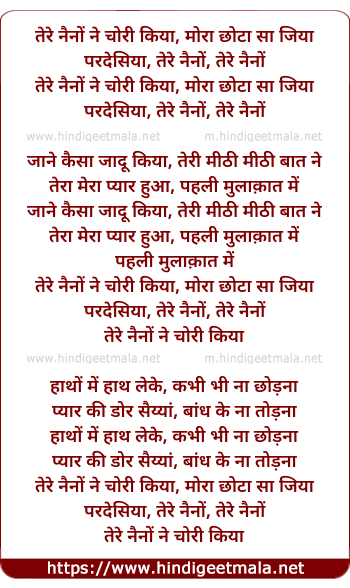 Lyrics of Tere Nainon Ne Chori Kiya, Mora Chhota Sa Jiya - तेरे नैनों ने चोरी किया, मोरा छोटा सा जिया