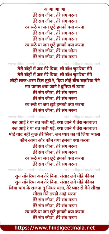 Lyrics of Tere Sang Jina, Tere Sang Marna - तेरे संग जीना, तेरे संग मरना