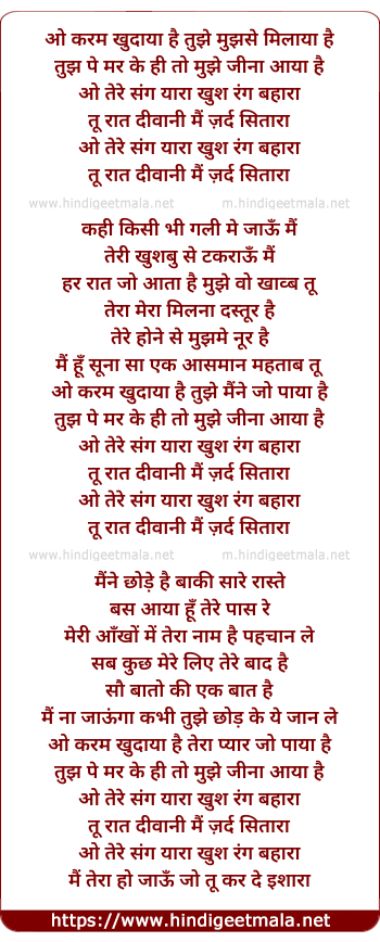 Lyrics of Tere Sang Yaraa - ओ करम खुदाया है तुझे मुझसे मिलाया है