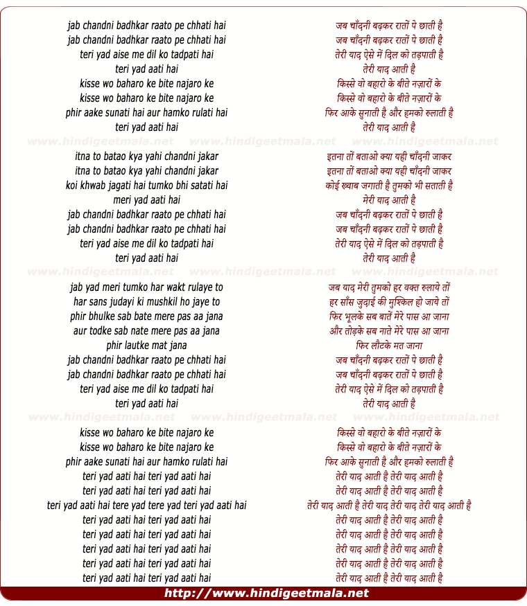 Lyrics of Tere Yad Aatee Hai - जब चाँदनी बढ़कर रातों पे छाती है