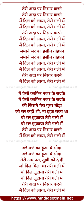 Lyrics of Teri Ada Par Nisar Karne, Mai Dil Ko Laya - तेरी अदा पर निसार करने, मैं दिल को लाया