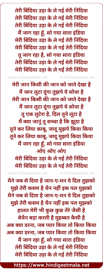 Lyrics of Teree Bindiya Udake Le Gayee Meree Nindiya - तेरी बिंदिया उड़ा के ले गई मेरी निंदिया
