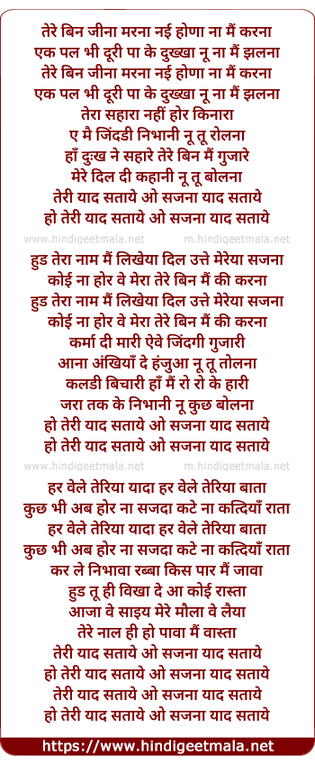 Lyrics of Teree Yaad - तेरे बिन जीना मरना नई होणा ना मैं करना