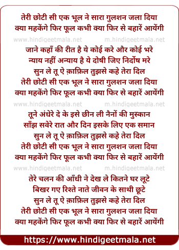 Lyrics of Teri Chhoti Si Ek Bhul Ne Sara Gulshan Jala Diya - तेरी छोटी सी एक भूल ने सारा गुलशन जला दिया