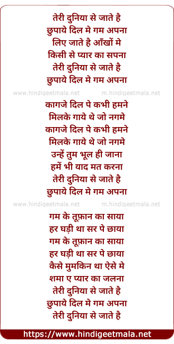 Lyrics of Teri Duniya Se Jate Hain, Chupaye Dil Me Gam Apna - तेरी दुनिया से जाते है, छुपाये दिल में गम अपना