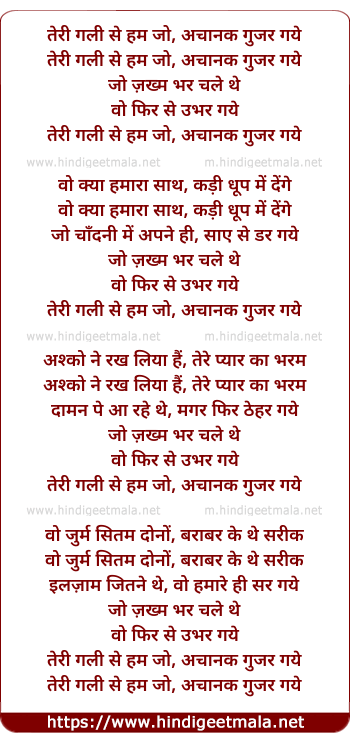 Lyrics of Teri Galee Se Hum Jo - तेरी गली से हम जो, अचानक गुजर गये