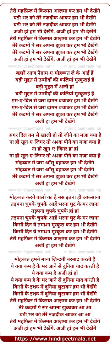 Lyrics of Teri Mehfil Me Kismat Aazma Kar Hum Bhi Dekhenge - तेरी महफ़िल में किस्मत आज़मा कर हम भी देखेंगे