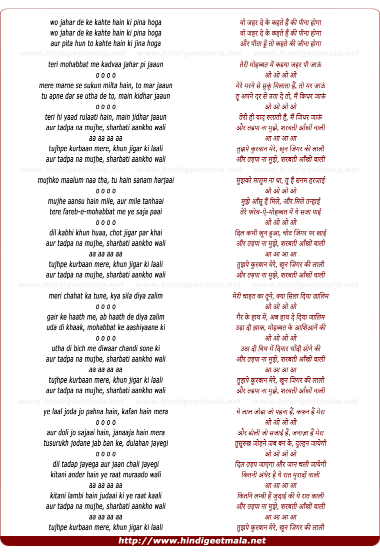 Lyrics of Teri Mohabbat Me Kadwa Jahar - वो जहर दे के कहते हैं की पीना होगा
