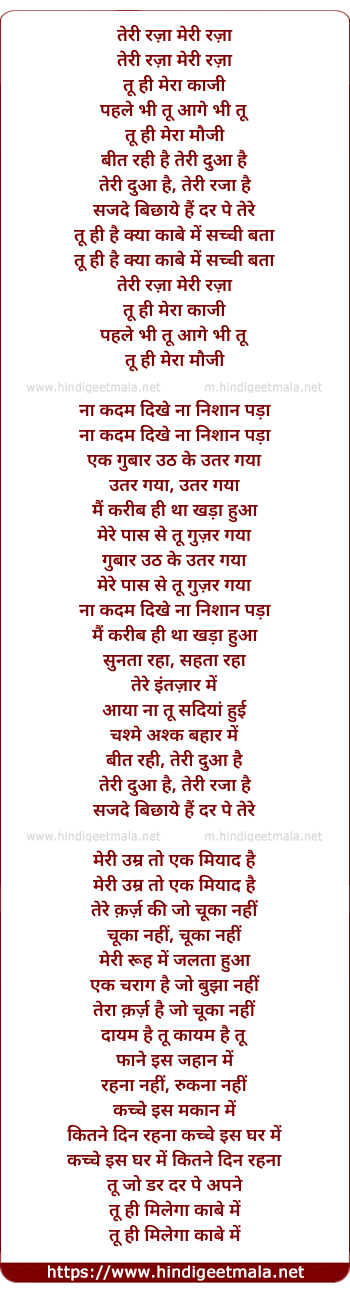 Lyrics of Teri Raza Meri Raza - तेरी रज़ा मेरी रज़ा