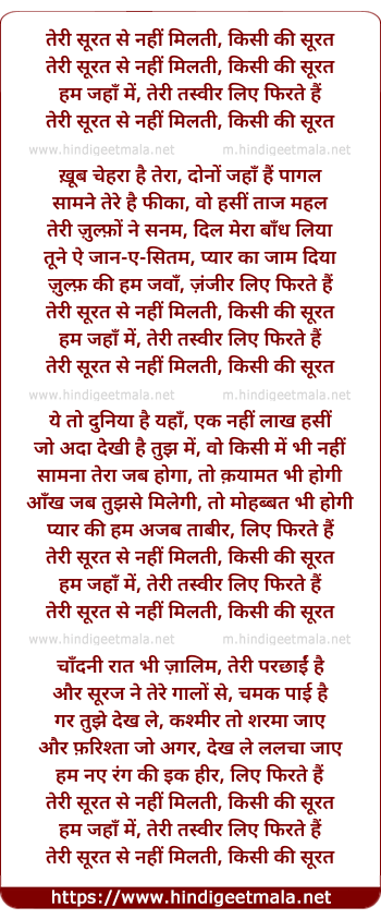 Lyrics of Teri Surat Se Nahi Milati Kisi Ki Surat - तेरी सूरत से नहीं मिलती, किसी की सूरत