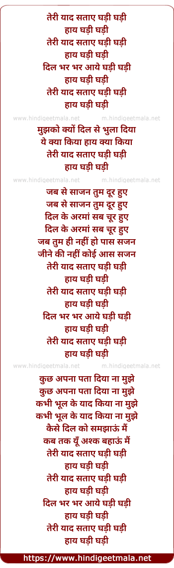 Lyrics of Teri Yaad Sataaye Ghadi Ghadi - तेरी याद सताए घड़ी घड़ी