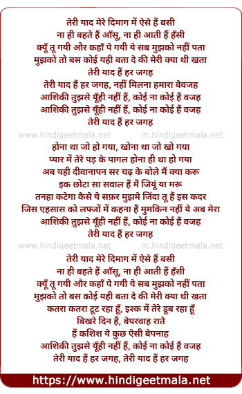 Lyrics of Teri Yaad (Teraa Surroor) - तेरी याद मेरे दिमाग में ऐसे हैं बसी