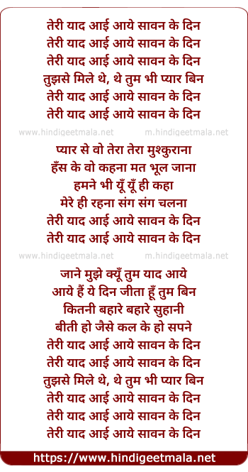 Lyrics of Teri Yad Aayi - तेरी याद आई आये सावन के दिन