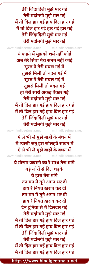 Lyrics of Teri Zinda Dilli Mujhe Mar Gai - तेरी जिंदादिली मुझे मार गई