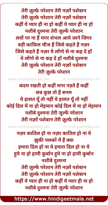 Lyrics of Teri Zulfe Pareshan Teri Najare - तेरी ज़ुल्फ़े परेशान तेरी नज़रें पशेबान