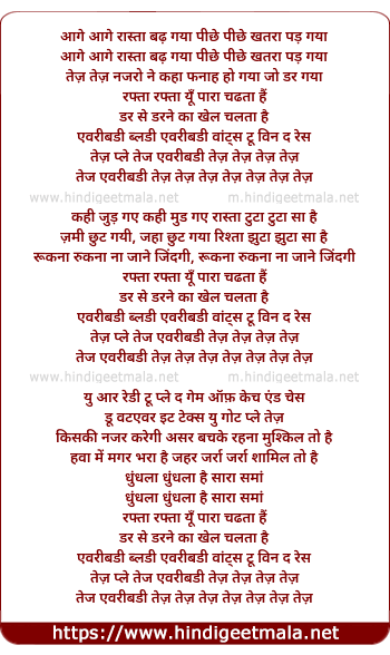 Lyrics of Tezz (Male) - आगे आगे रास्ता बढ़ गया पीछे पीछे खतरा पड़ गया