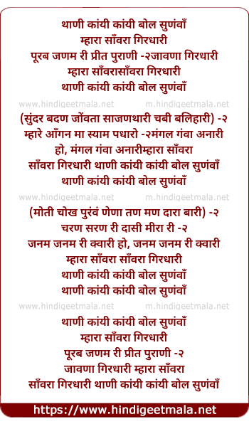 Lyrics of Thaani Kaanyi Kaanyi Bol Sunanvaan Miraa Bhajan - थाणी कांयी कांयी बोल सुणंवाँ