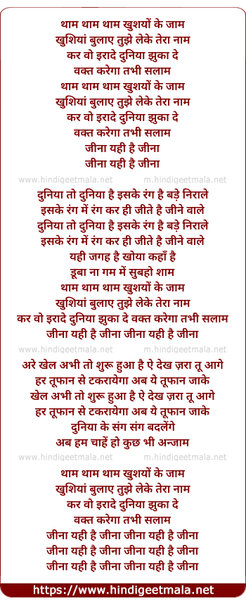 Lyrics of Tham Khushiyo Ke Jhaam Khushiya Bhulaye Tujhe Le Ke Tera Naam - थाम खुशयों के जाम खुशियाँ बुलाये तुझे ले के तेरा नाम