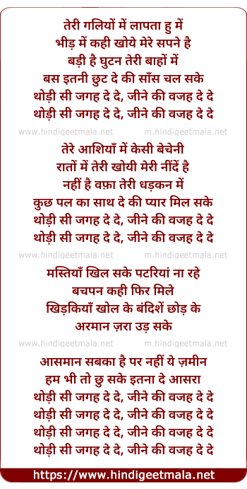 Lyrics of Thodi Si Jagah De De - थोड़ी सी जगह दे दे