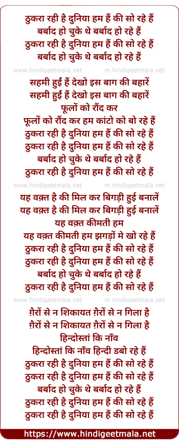 Lyrics of Thukara Rahi Hai Duniya Ham Hain Ki So Rahe Hain - ठुकरा रही है दुनिया हम हैं की सो रहे हैं