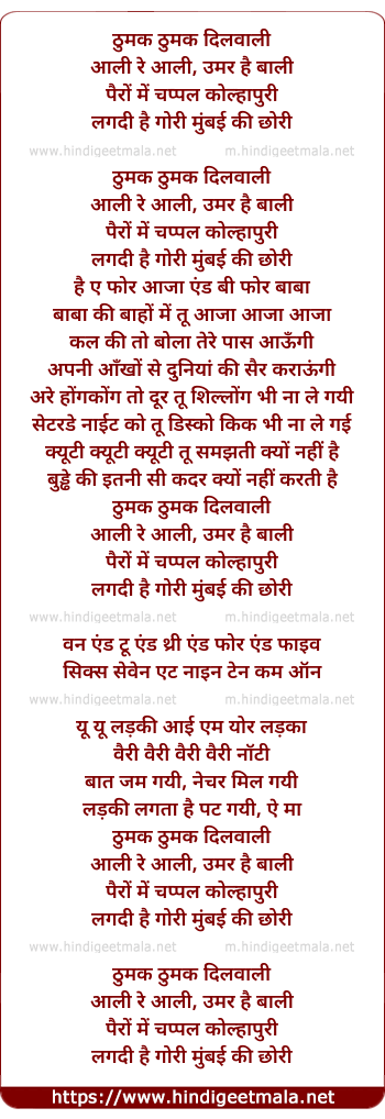 Lyrics of Thumka Thumka Dilwaali - ठुमक ठुमक दिलवाली
