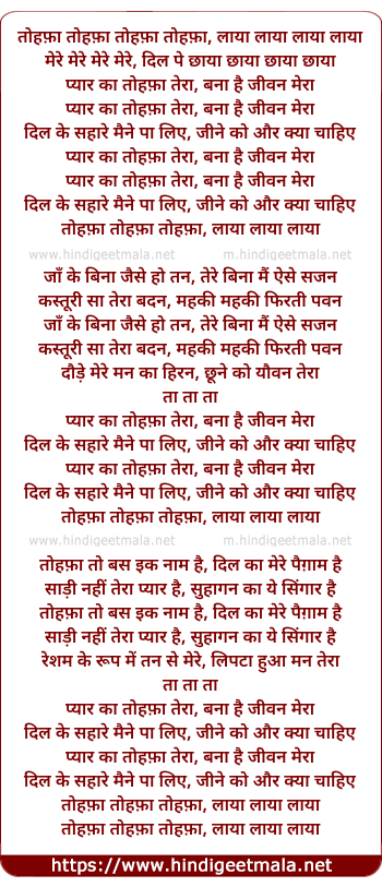 Lyrics of Pyaar Kaa Tohafaa Teraa Banaa Hai Jivan Meraa - प्यार का तोहफ़ा तेरा बना है जीवन मेरा
