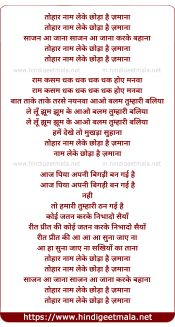 Lyrics of Tohar Naam Lai Ke Chhoda Hai Zamana - तोहार नाम लेके छोड़ा है ज़माना