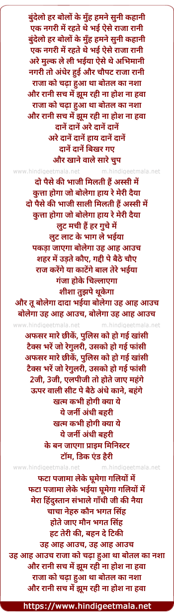Poetic Translation - Lyrics of Tom, Dick & Harri - बुंदेलो हर बोलों के मुँह हमने सुनी कहानी