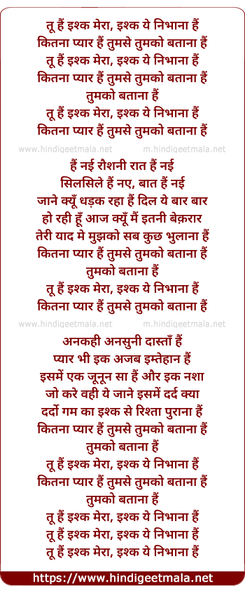 Lyrics of Too Hai Ishk Meraa, Ishk Yeh Nibhana Hai - तू हैं इश्क मेरा, इश्क ये निभाना हैं