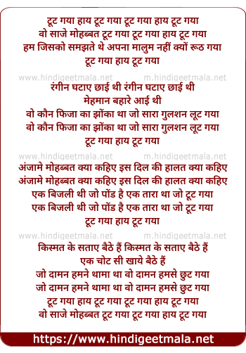Lyrics of Toot Gaya Haye Toot Gaya - टूट गया हाय टूट गया
