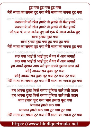 Lyrics of Toot Gaya Meri Mata Ka Sapna - टूट गया टूट गया टूट गया