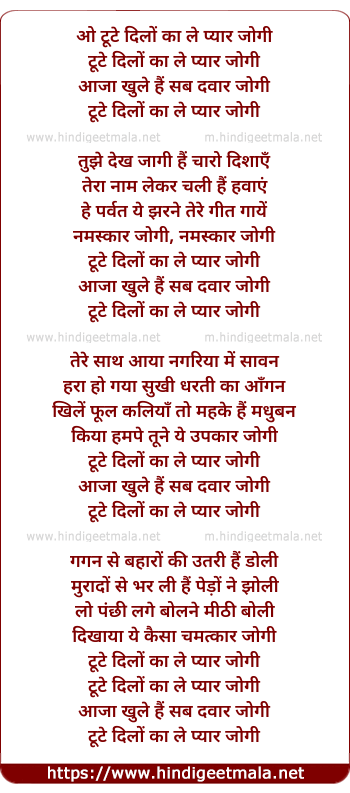 Lyrics of Toote Dilo Ka Le Pyar - टूटे दिलों का ले प्यार