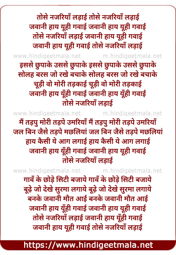 Lyrics of Tose Najariyaa Ladayi - तोसे नजरियाँ लड़ाई