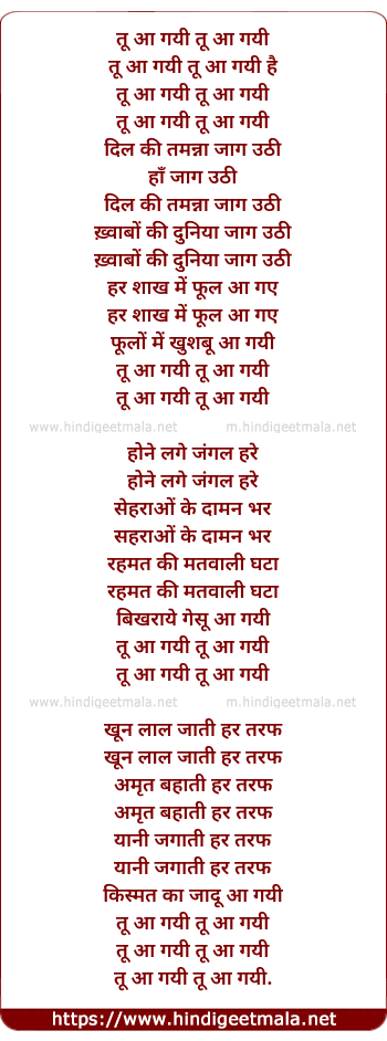 Poetic Translation - Lyrics of Tu Aa Gayi - तू आ गई
