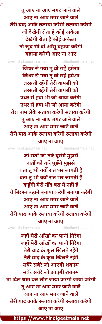 Lyrics of Tu Aaye Na Aaye Magar Jane Vale - तू आए ना आए मगर जाने वाले