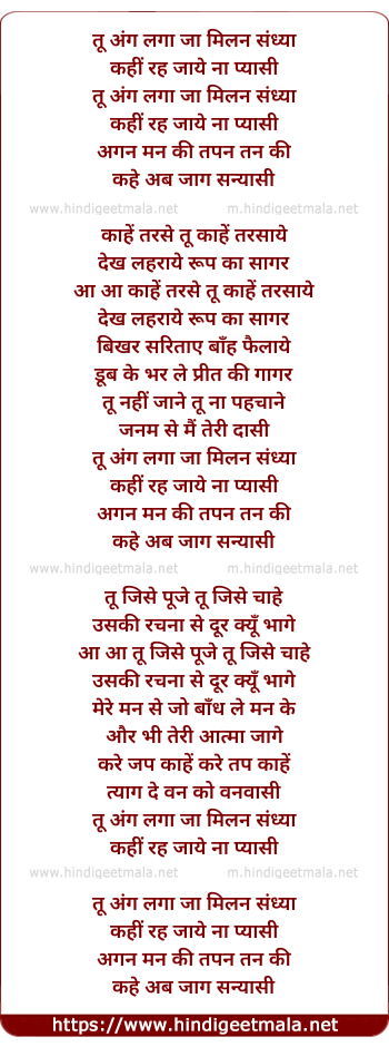 Lyrics of Tu Ang Laga Ja - तू अंग लगा जा