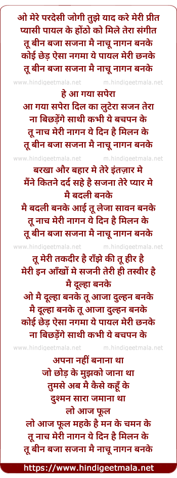 Lyrics of Tu Been Baja Sajna, Mai Naachu Naagin Banke - तू बीन बजा सजना मै नाचू नागन बनके