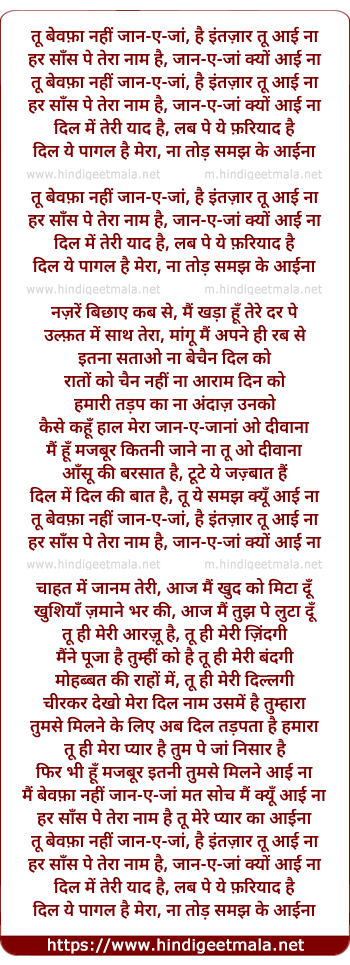 Lyrics of Tu Bevafa Nahee Janejan Hai Intejar Tu - तू बेवफ़ा नहीं जान-ए-जां, है इंतज़ार तू आई ना