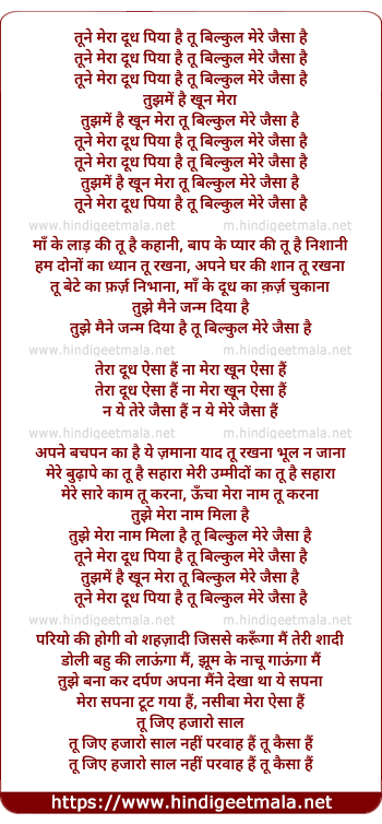 Lyrics of Tune Mera Dudh Piya Hai Tu Bilkul Mere Jaisa Hai - तूने मेरा दूध पिया है तू बिल्कुल मेरे जैसा है