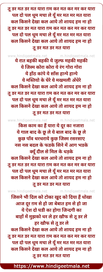 Lyrics of Tu Darr Mat Darr Mat Yara - तू डर मत डर मत यारा