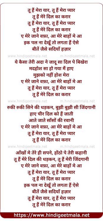 Lyrics of Tu Hai Mera Yaar, Tu Hai Mera Pyar - तू हैं मेरा यार, तू हैं मेरा प्यार