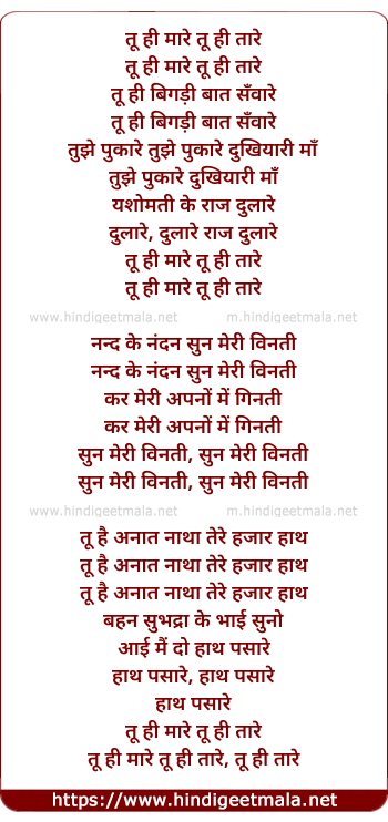 Lyrics of Tu Hi Mare Tu Hi Tare Bigdi Baat Sanware - तू ही मारे तू ही तारे बिगड़ी बात सँवारे