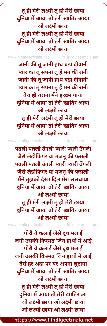 Lyrics of Tu Hi Meri Laxmi Tu Hi Meri Chaya - तू ही मेरी लक्ष्मी तू ही मेरी छाया