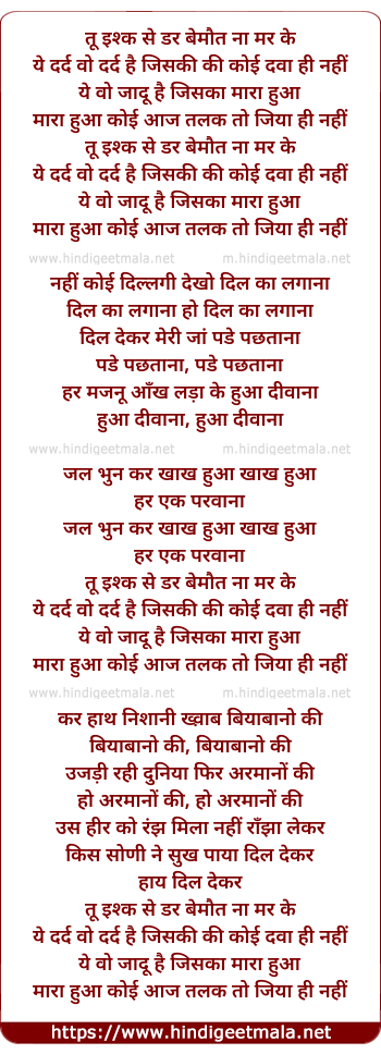 Lyrics of Tu Ishq Se Dar Bemaut Na Mar - तू इश्क से डर बेमौत ना मर