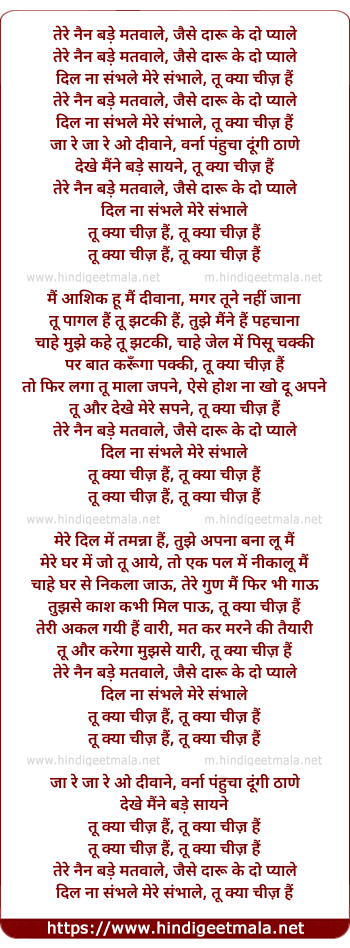 Lyrics of Tu Kya Cheez Hai, Tere Nain Bade Matwale - तू क्या चीज़ हैं, तेरे नैन बड़े मतवाले