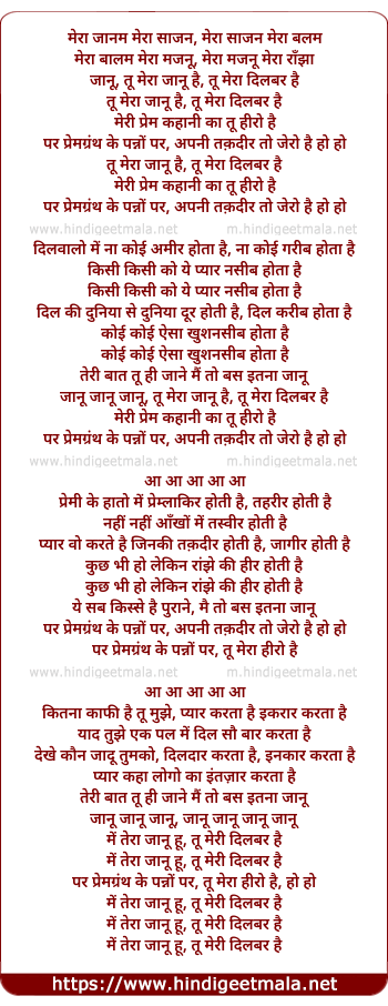 Lyrics of Tu Mera Janu Hai, Tu Mera Dilbar - तू मेरा जानू है, तू मेरा दिलबर